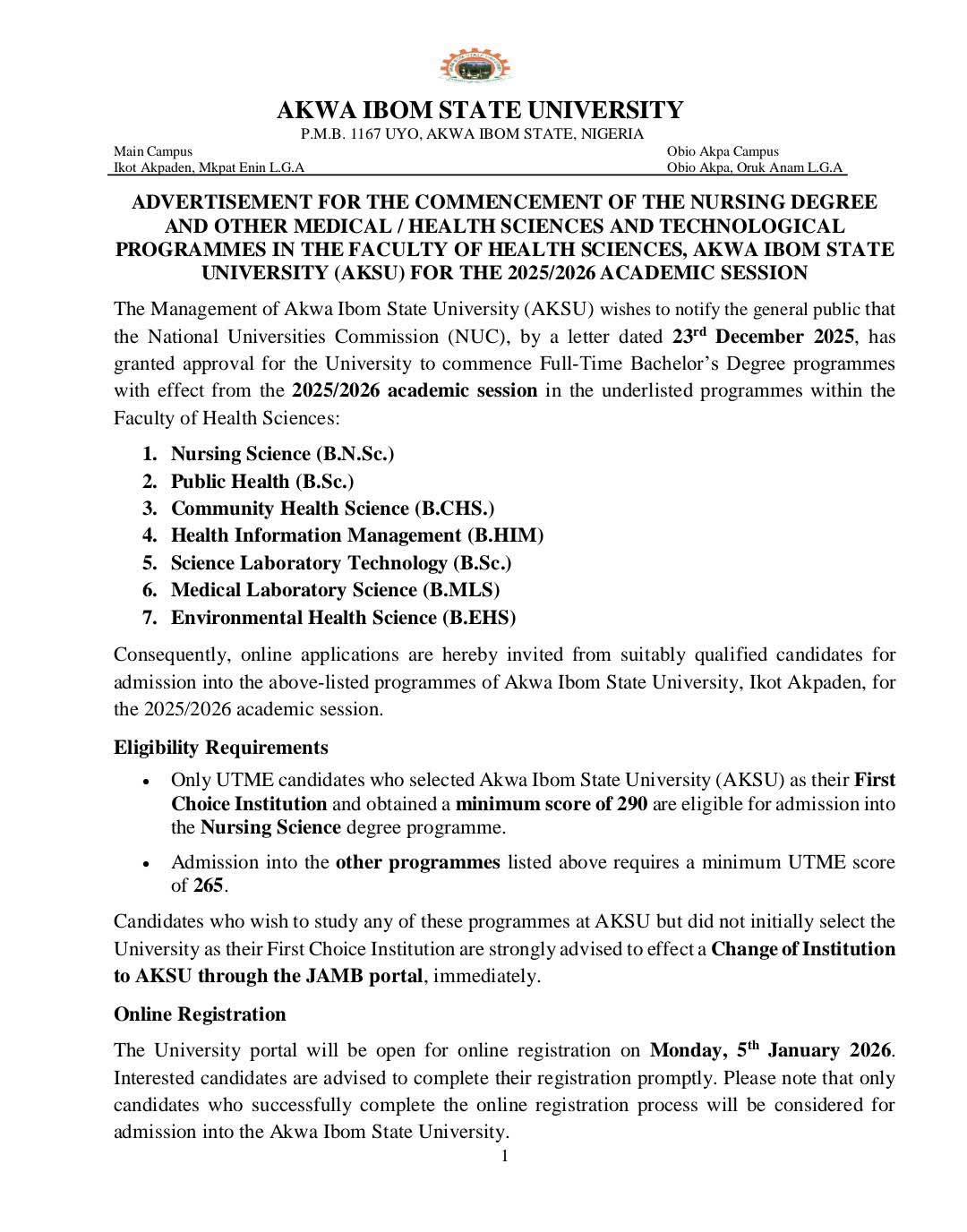Akwa Ibom State University (AKSU) has now started offering nursing and other health‑related degree programmes.