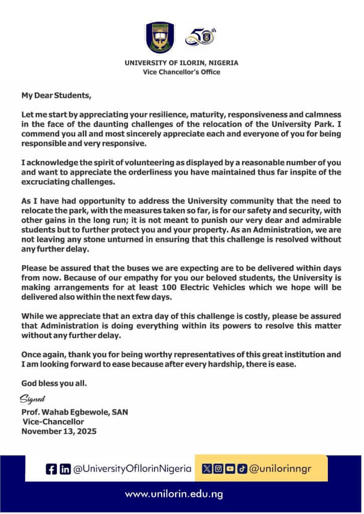 In a bold move toward sustainable campus mobility, the Vice-Chancellor of the University of Ilorin has announced that electric vehicles are set to be introduced to ease the ongoing transportation crisis faced by students and staff. Speaking on the initiative, the VC emphasized that the university is committed to providing innovative and eco-friendly solutions to the persistent mobility challenges that have affected academic activities and student welfare. The electric buses, according to him, will not only reduce long queues and delays but also align with global efforts to promote clean energy and environmental sustainability.